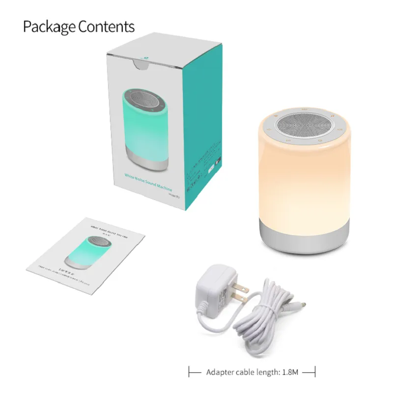Uyqu chiroqida oq shovqin, pushti shovqin, jigarrang shovqin, fan shovqini, momaqaldiroq, daryo yomg'iri, dengiz to'lqinlari, olov, kriketlar, qurbaqa, poezd ovozi, yurak urishi, lullaby va boshqalar mavjud. Kichkintoy, bolalar va kattalar uyqusida yordam berish uchun dam olish funksiyasi bilan uxlab yotgan munosib ovoz mashinasi. Va u yarim tunda emizish va taglikni almashtirish, bolalarni tinchlantirish uchun ishlatiladi. 7 ta rang LED, xira oq, yorqin oq, qizil, ko'k, yashil, binafsha, to'q sariq rang mavjud.